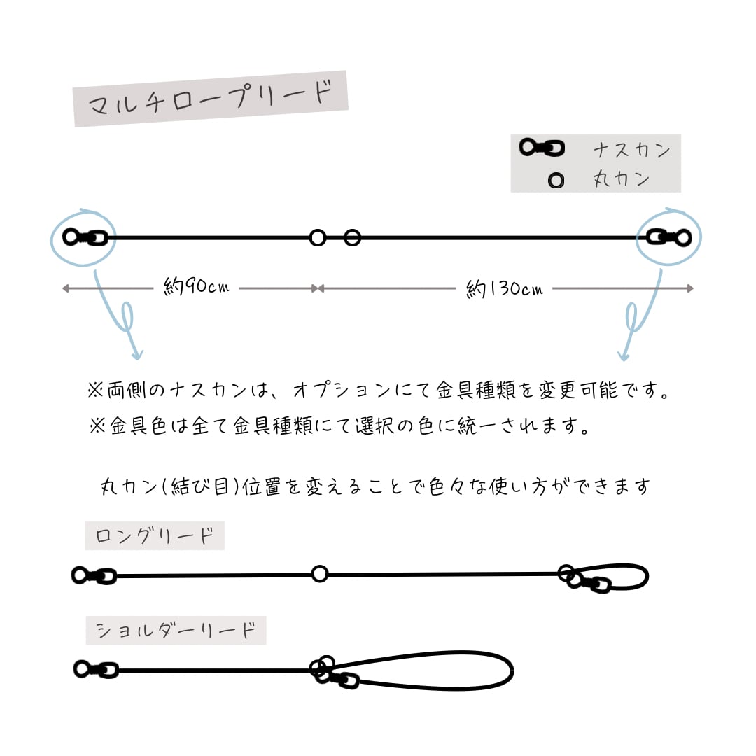 丸カン(結び目)の位置を変えることで、ショルダーリード、ウエストリード、ロングリード、スタンダードリードなど多様な使い方が可能です。