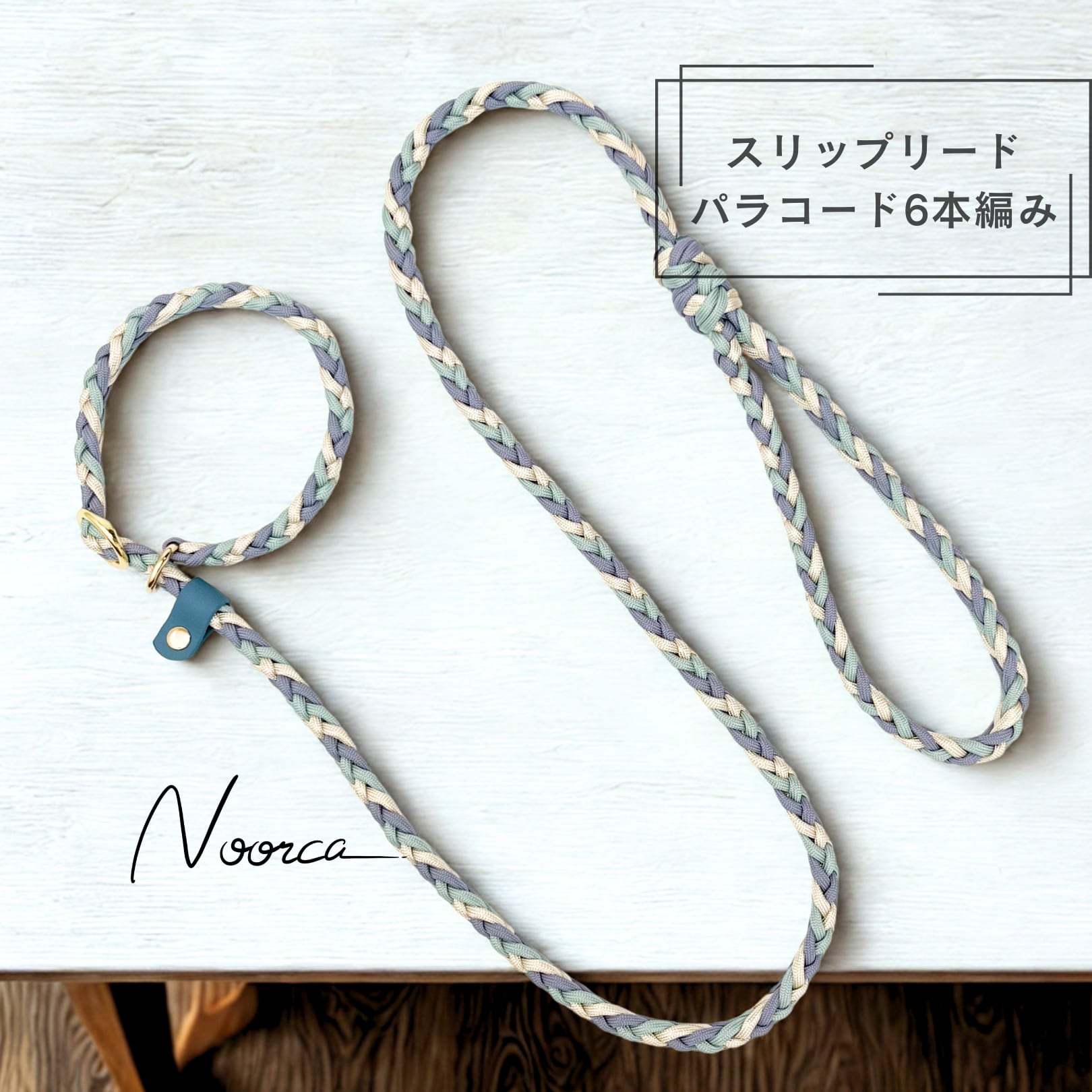 軽くて丈夫で水洗いもできるパラコードで作られた、リードと首輪が一体となったスリップリード6本編みです。首回りサイズは金具にて最小内周とBioThaneストッパーにて最大内周を調節可能です。リードを引くと首輪部分が締まる仕組みになっており、しつけや訓練に使われることが多いリードです。