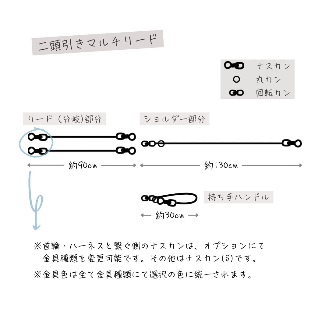 ◎セットにショルダー部分を1本追加したい場合や、リード1本と持ち手のみ購入したい場合など、各パーツを単体で購入可能です。