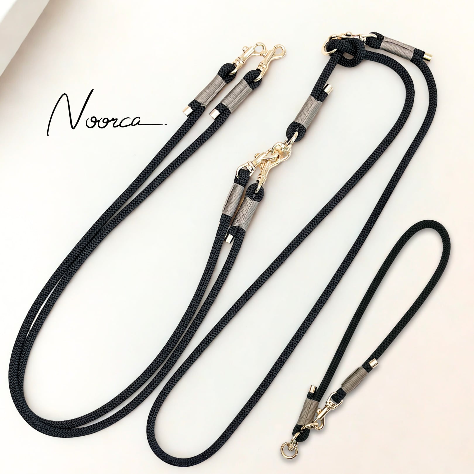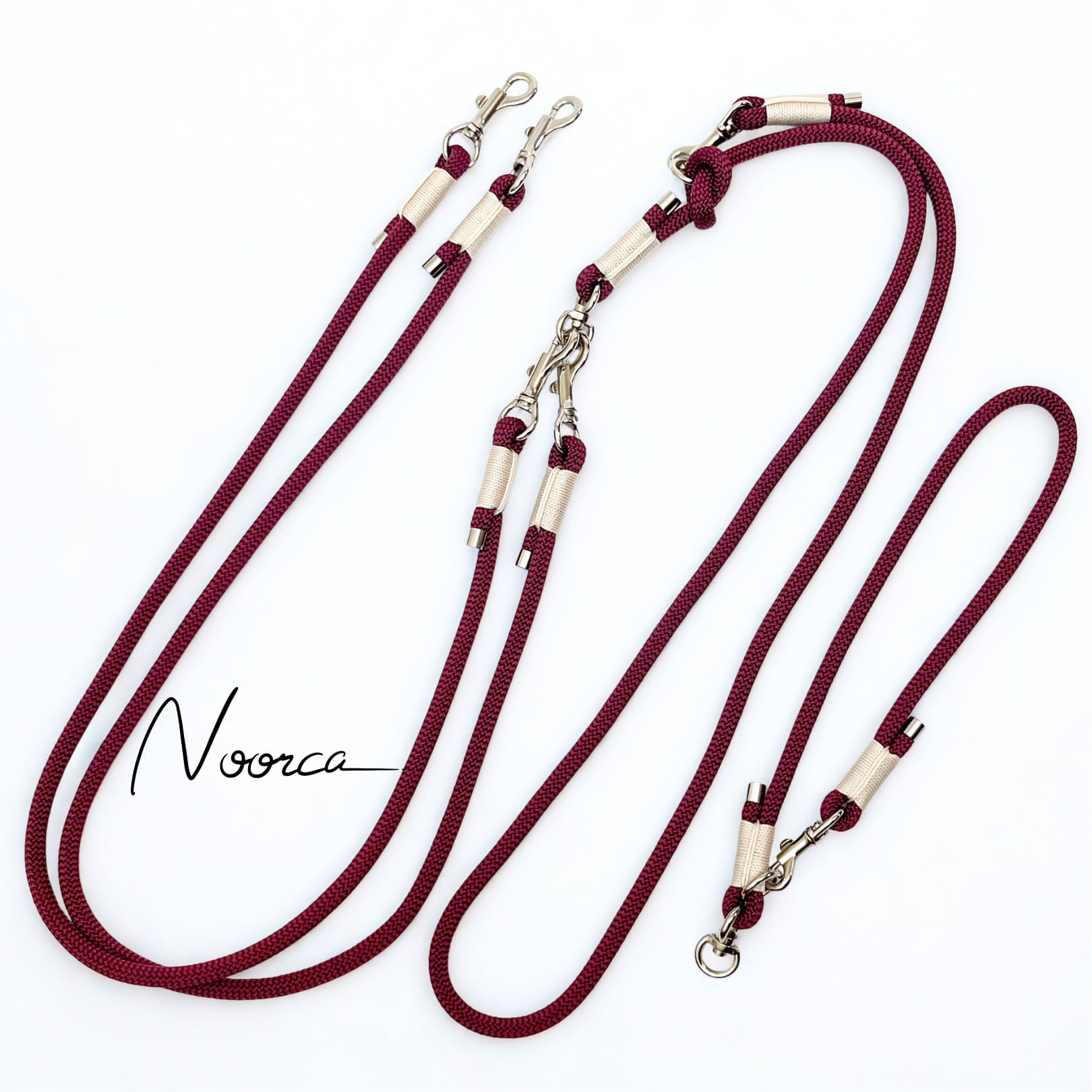 丸カン(結び目)の位置を変えることで、ショルダーリード、ウエストリード、ロングリードなど多様な使い方が可能な二頭引きのマルチショルダーリードS