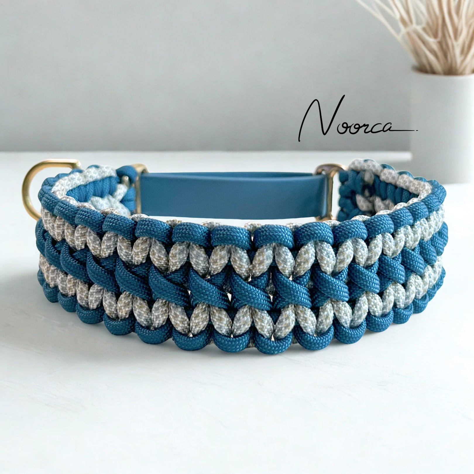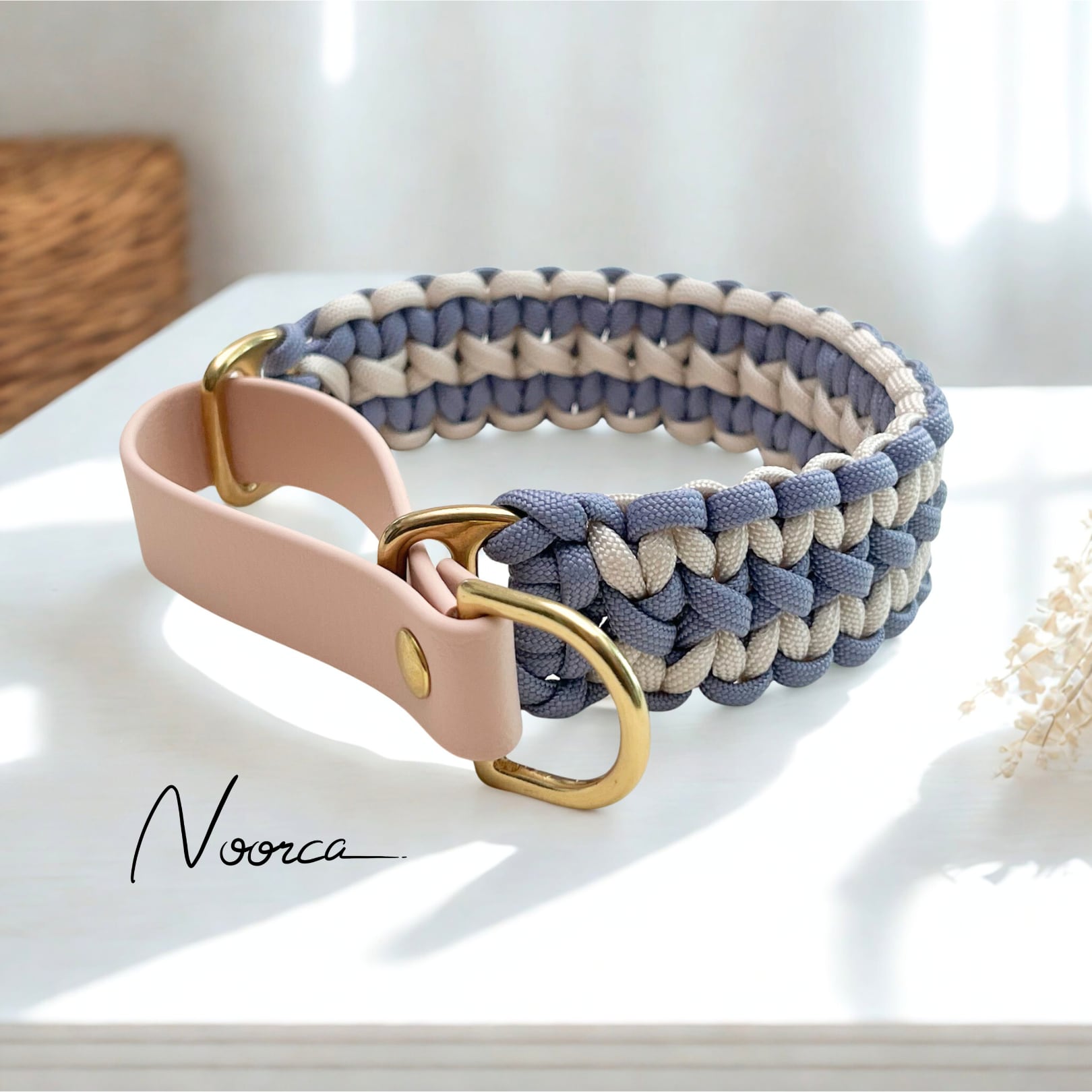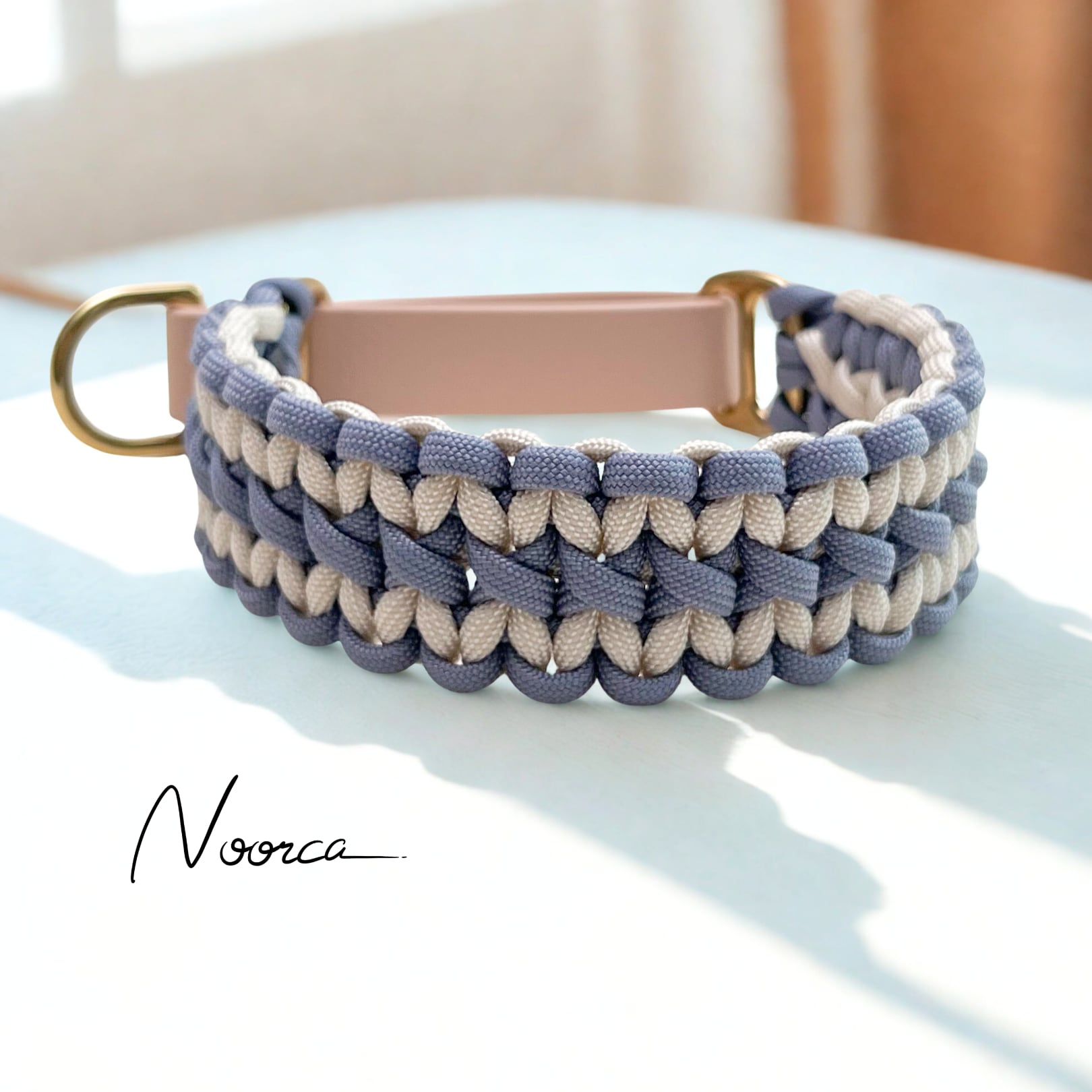 パラコードで編み込んだ首輪部分と防水・防汚素材のBioThaneを使ったスリップ部分で作るマーチンゲールカラーです。